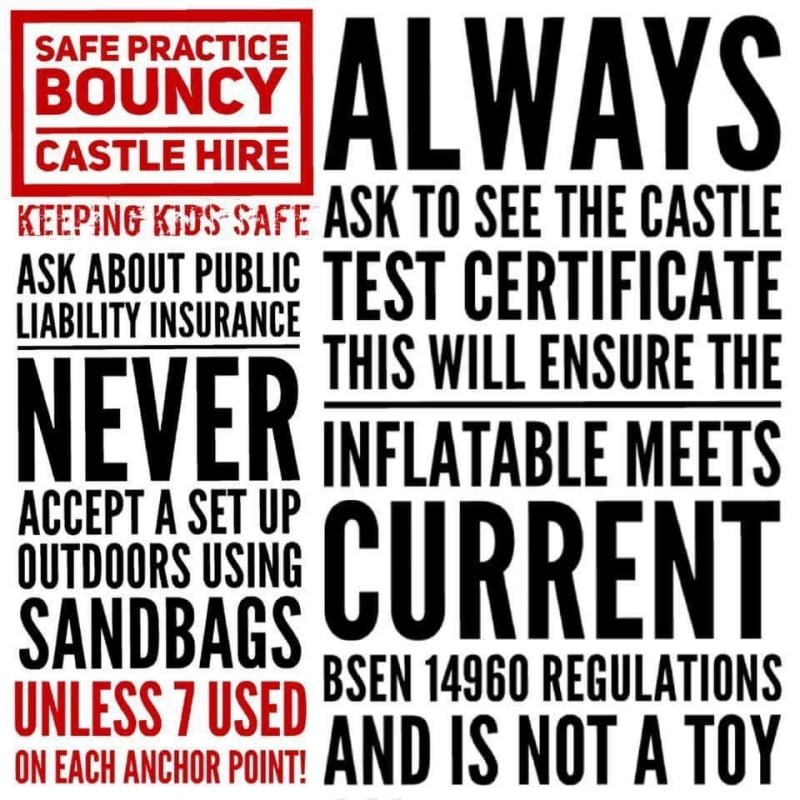 Also never be afraid to challenge an operator to see their insurance policy and the safety test certificate for the inflatable you are hiring (without this annual test certificate the Insurance will be invalid) A good operator will happily show these to you.