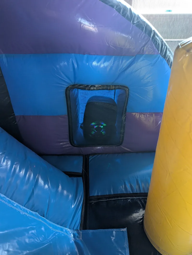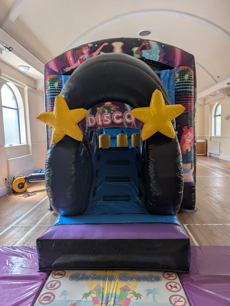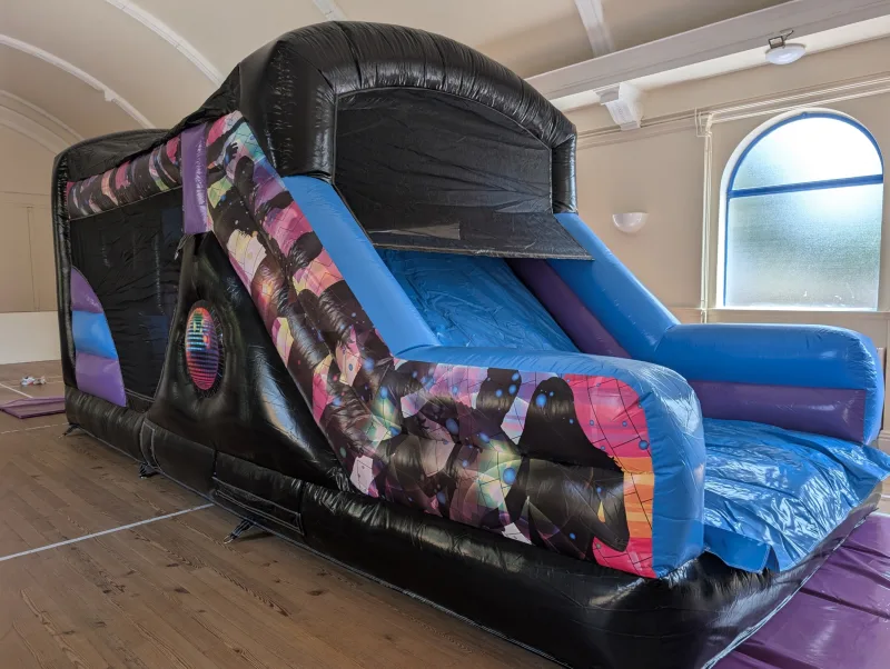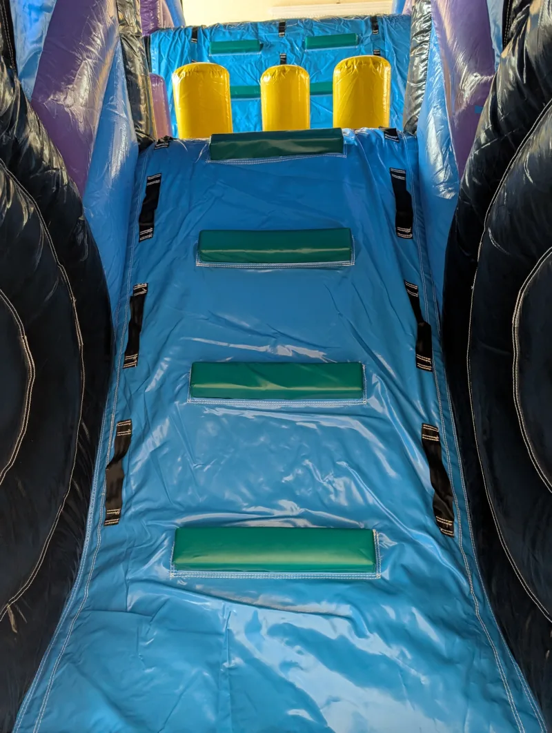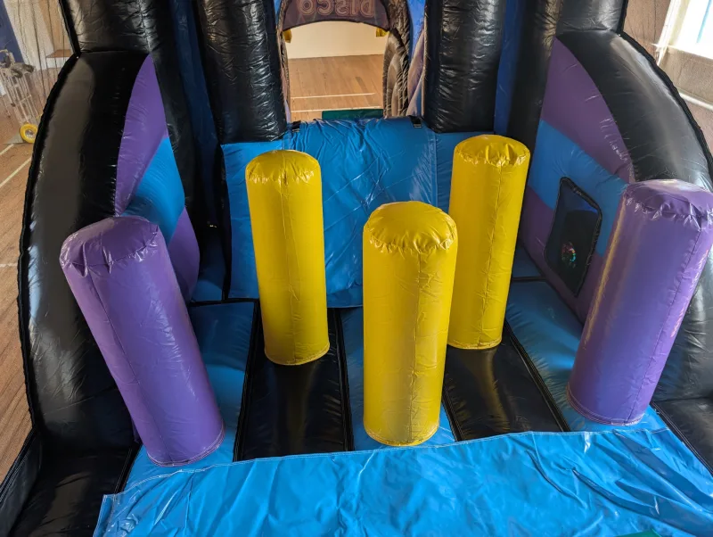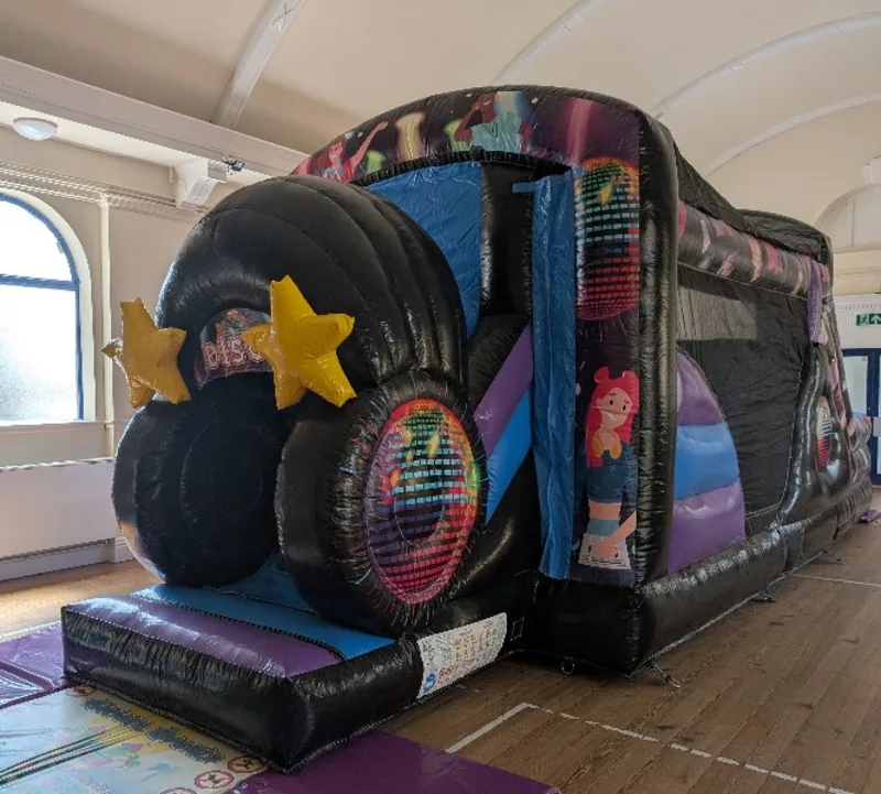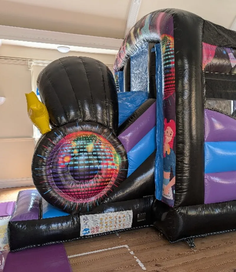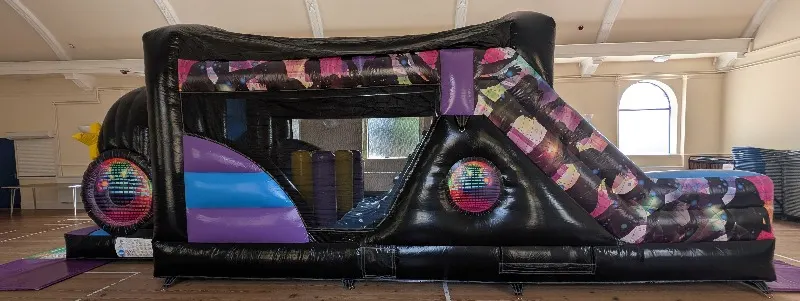 This is our 30ft 3D Disco Obstacle Course, Assault Course or Fun Run & for an additonal £15 you can also inclue a bluetooth disco speaker so you can play your own music inside the inflatable.