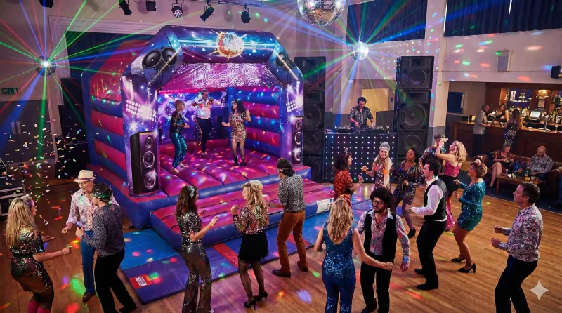 Why go to a nightclub when you can bounce in one? Our Adult Disco Bouncy Castle brings the party to you! Combining a full-size adult inflatable with a high-tech sound and light system, it is the perfect centrepiece for milestone birthdays, wedding receptions, and corporate events in Torquay, Paignton, Brixham, Newton Abbot, and Teignmouth.