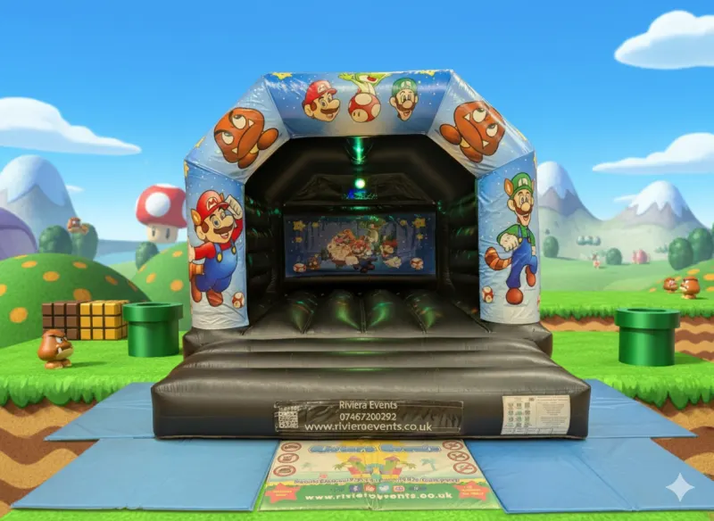 "It's-a me, Mario!" Get ready to jump, bounce, and dance with our incredible Mario Disco Bouncy Castle. Combining the world's most famous video game hero with a high-tech disco system, this is the ultimate party piece for gamers in Torquay, Paignton, Brixham, Newton Abbot, and Teignmouth.
